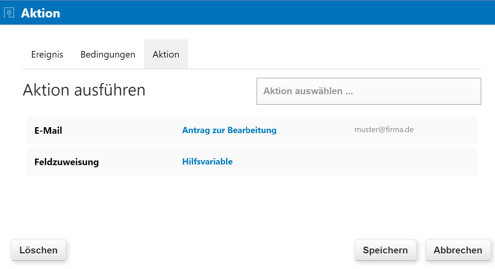 “Variable wird aus der Daten-Datei eingelesen” und “Variable wird in die Daten-Datei geschrieben” ein Häkchen besitzen.“Element aktualisiert” ausgelöst wird. Dieses Ereignis tritt jedes Mal ein, wenn im Formular für einen bereits bestehenden Datensatz ein erneuter Speicherprozess ausgeführt wird. Für die Fallunterscheidung, ob ein Datei-Anhang bei der Aktion berücksichtigt werden soll oder nicht, benötigen wir daher die Hilfsvariable im nächsten Schritt.“Aktion” in den Reiter “Bedingungen”. Als Bedingungen zur Ausführung der Aktion legen Sie fest, dass Ihre Hilfsvariable den vorbestimmten Wert haben muss. Das ist in unserem Beispiel der Wert “1”, welcher anzeigt, dass es einen Datei-Anhang im Datensatz gibt, der bei dem nachfolgenden E-Mailversand an die Nachricht angehängt werden soll. “Aktion” in den Reiter “Aktion”. Wählen Sie in dem Feld “Aktion ausführen” die Option “E-Mail-Benachrichtigung” aus. In dem darauf folgenden Dialog tragen Sie in dem Feld “Anlagen” als Platzhalter den Controlnamen des betreffenden AttachmentControls aus Ihrem Formular ein, z. B. in der Form [@attachments_1]. Wenn Sie auch alle anderen Felder nach Ihren Wünschen angepasst haben, übernehmen Sie Ihre Einstellungen. Der Dialog wird geschlossen.“Aktion ausführen” die Option “Feldzuweisung” aus. Setzen Sie nun Ihre Hilfsvariable, welche Sie in der oberen Klappliste markieren, wieder auf einen anderen Wert zurück, z. B. leer (NULL). So kennzeichnen Sie in dem betreffenden Datensatz, dass der E-Mail-Versand mit Datei-Anhang erfolgt ist. Bestätigen Sie Ihre Eingaben.Erwarten Sie große Datenmengen als Anhang in Ihrem Formular, empfehlen wir zusätzlich die asynchrone Datenübertragung im Web-Formular zu wählen.