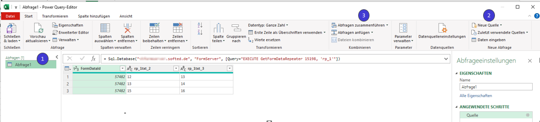 9. Im Power Query-Editor befinden sich nun zwei Abfragen, die Sie zusammenführen können. Wählen Sie dazu die Stammdatentabelle aus und gehen Sie dann in der oberen Menüleiste zu Abfragen zusammenführen. Im sich öffnenden Fenster wählen Sie zuerst die weitere Tabelle aus und klicken Sie in beiden Tabellen auf die Spalte FormDataID.