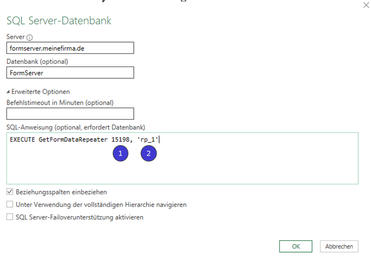 2. Geben Sie nun den Namen des Servers und der Datenbank ein, erweitern Sie den Punkt “Erweiterte Optionen” und fügen Sie die SQL-Anweisung nach folgendem Schema ein: